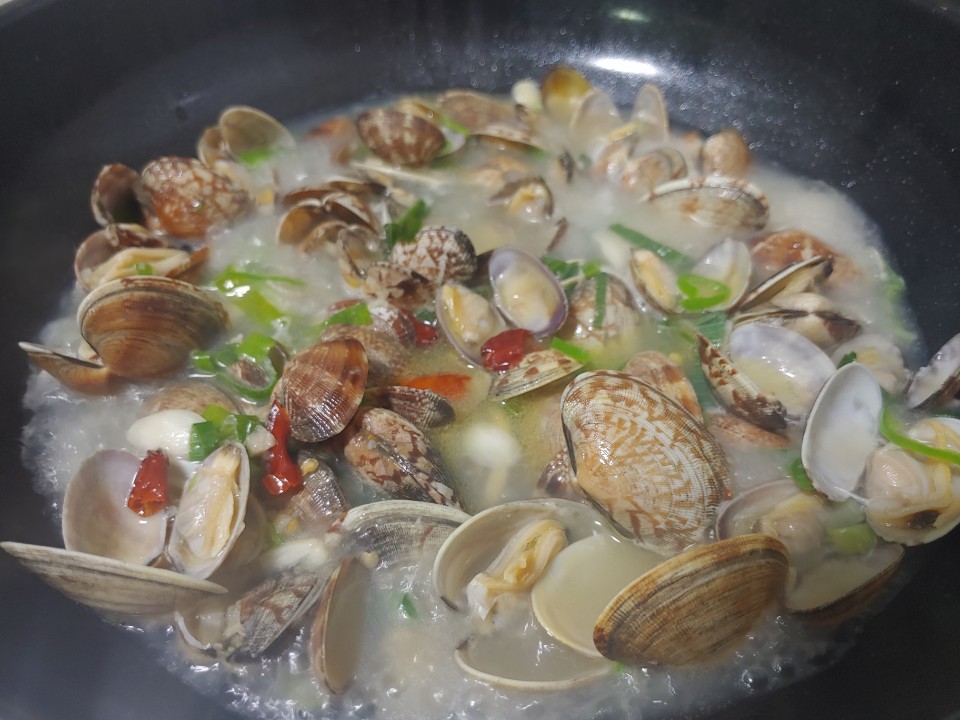 뚜껑덮고 바지락 입을 다 벌릴때까지 팔팔 끓여주면 바지락 술찜 완성입니다.
