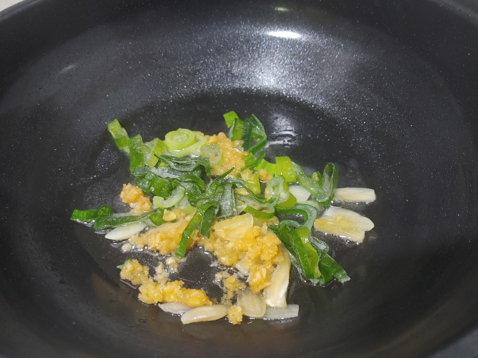 냄비에 기름 두르고 다진마늘,그리고 파를 넣어서 기름을 내어주었습니다.전에 썰어놓은 편마늘도 조금 있어서
