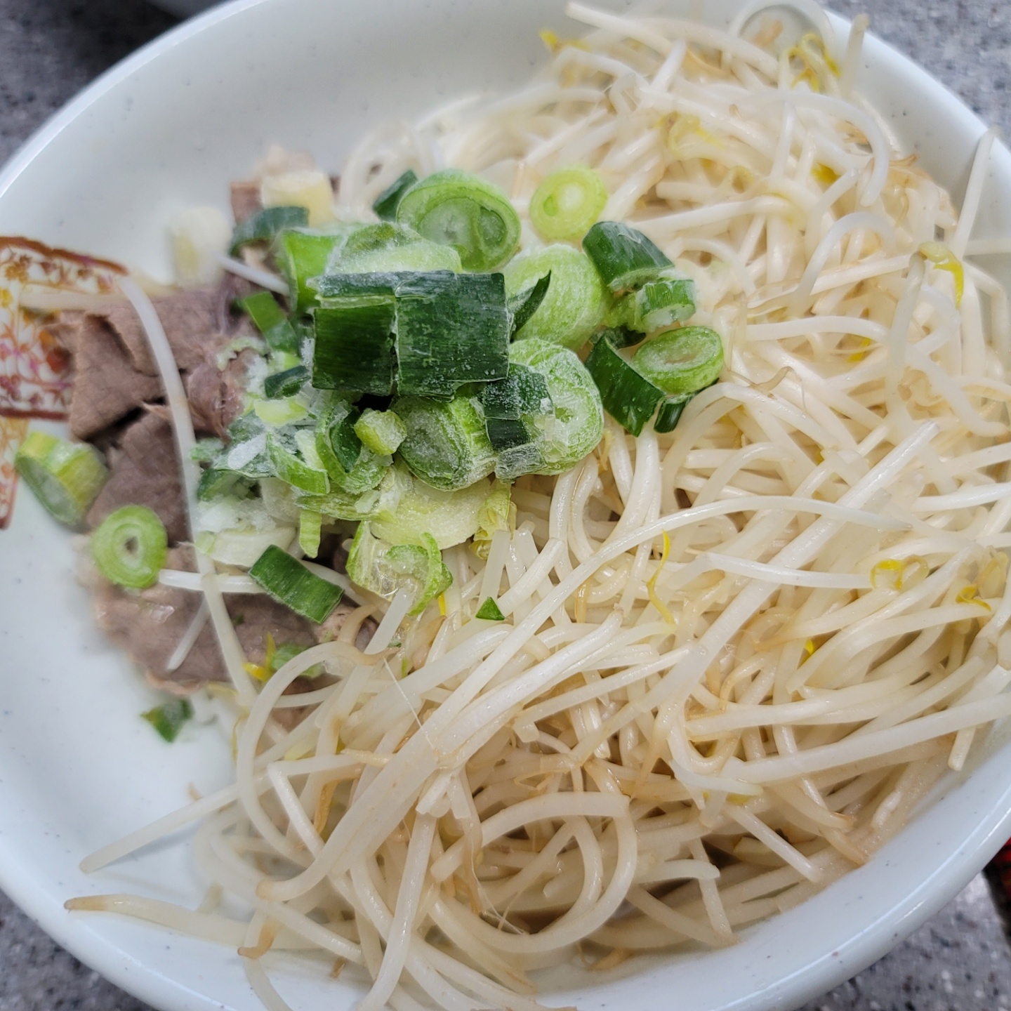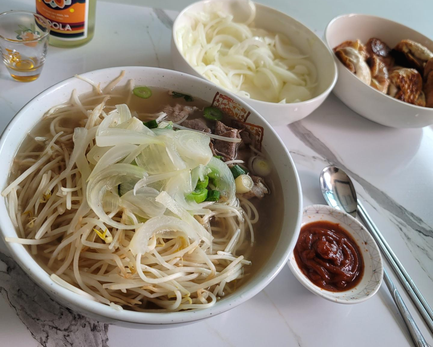 담아놓은 쌀국수면에 데친 소고기와 숙주나물을 얹고 대파도 넣어줍니다.